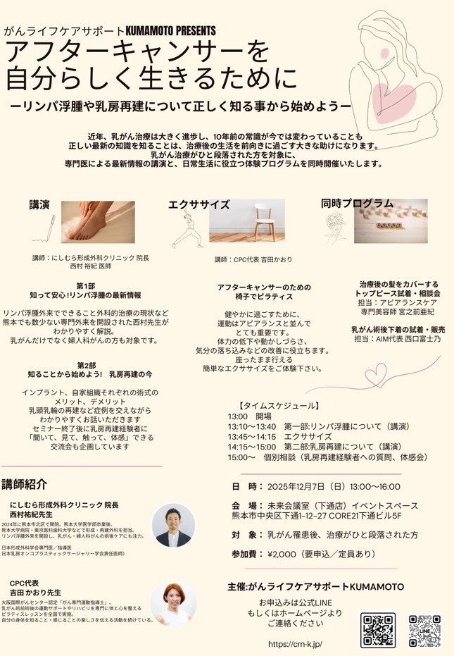 またこのたび、がん専門運動指導士の資格を取得し、熊本市のWork Arts内に開設されている、CPC(Cancer-Survivor Post-rehabilitation Center)の機能も併設することになりました。これからは、がんサバイバーの方たちのポストリハビリテーションについても取り組んでまいります。リハビリをルーツにもつピラティスの素晴らしさをより多くの方に知っていただきたいと、心の底から強く考えております。